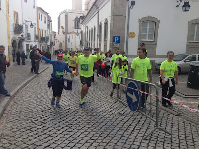 A hora da partida estava a chegar rapidamente, então despedimos da Mãe ovelha caminhante e seguimos para o corredor da partida :) A Mãe ovelha caminhante ia partir ao mesmo tempo que nós para a sua caminhada :) Desafiamos o Finhão para nos acompanhar na corrida, porque como continuo atacada dos pulmões por causa da constipação... ele ia conseguir acompanhar-nos sem problemas! Ele hesitou, mas acabou por vir connosco :) Fomos percorrendo as ruas apertadas da cidade e a minha lebre nunca me deixou :) Ao km 5 havia um abastecimento :) com água muito fresca! Bebi dois golinhos e molhei a cara para me refrescar! Estava a fazer de tudo para acompanhar o passo da minha lebre :) estava cada vez mais aflita para respirar e então a minha lebre começou a chamar e a puxar por mim! batia palmas e não me deixava pensar nas dificuldades :) Antes do km 6 perdemos o Finhão de vista :) que foi a muito boa velocidade ;) E nós fomos seguindo o nosso caminho :) Ao km 9.2 começam as subidas! Subimos para a estação de Évora e depois subimos ao parque e depois..... depois é que foram elas.... 10 kms percorridos! E ainda faltava a subida para o Giraldo! Quando a minha lebre me diz: "Dá-me o teu telemovel!! Vamos ligar para a tua irmã!!!" Juntei as forças que tinha, procurei no telemóvel o Facetime, procurei a minha companheira e ligamos para ela! A minha lebre ia com o meu telemóvel na mão esquerda e a mão direita a agarrar a minha!! Foi um troço super emocionante!!!! A minha companheira estava doente.... e estava deitada quando lhe ligamos.... eu fiquei muito emocionada de a ver!!! E ela de nos ver!! A minha lebre foi-lhe mostrando a festa linda que estava a acontecer em Évora!! As pessoas à beira da subida, a tuna que animava os corredores!!! E lá fomos nós!! A Finhona estava quase no cimo da subida e começou a gritar por nós!!! :D Muito emocionante ver ali a nossa Finhona!!