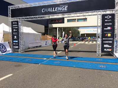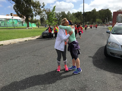 A Mãe ovelha caminhante ficou para trás para tirar uma foto e, as ovelhas corredoras em pares, arrancaram juntas :) eu arranquei com a minha companheira e, a minha lebre com a ovelha corredora alentejana :) a Mãe ovelha apanhou-nos rapidamente e despedimos-nos até à meta :) fomos as duas ziguezagueando pela multidão que fazia barreira e tornava a passagem dificil, mas pedindo licença aqui e ali, fomos avançando :) O calor apertava e fomos avançando pelas sombrinhas :) antes do primeiro abastecimento vimos a ovelha corredora alentejana a caminhar e, da minha lebre nem sinal...... fomos andando e, desfrutando de uma bela vista :) o abastecimento chegou aos cerca de 3 kms e soube muito bem :) um bocado mais à frente estavam os bombeiros com mangueiras para refrescar a malta :) chegamos a uma ponte pedonal e estávamos a 1 km da meta :) a corrida chegou ao fim rapidamente :) cruzamos a meta de mão dada, como sempre!!!