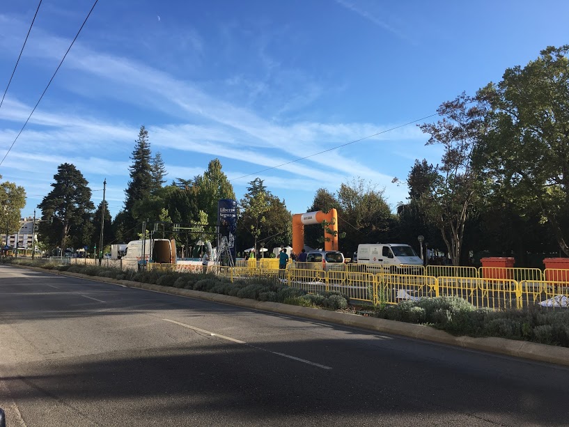 Ao chegar ao Mosteiro de Santa Clara a Velha parámos um pouco para descansar :) e decidimos ir até ao hotel descansar um pouco as pernas! Porque a perna da minha ovelha companheira gémea estava a queixar-se muito! Ao chegar à porta do hotel vimos a organização da corrida a começar a montar as coisas todas!! Os porticos insufláveis, a meta com o cronómetro.... um espetáculo!! :)