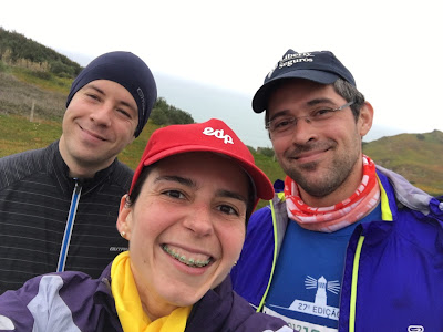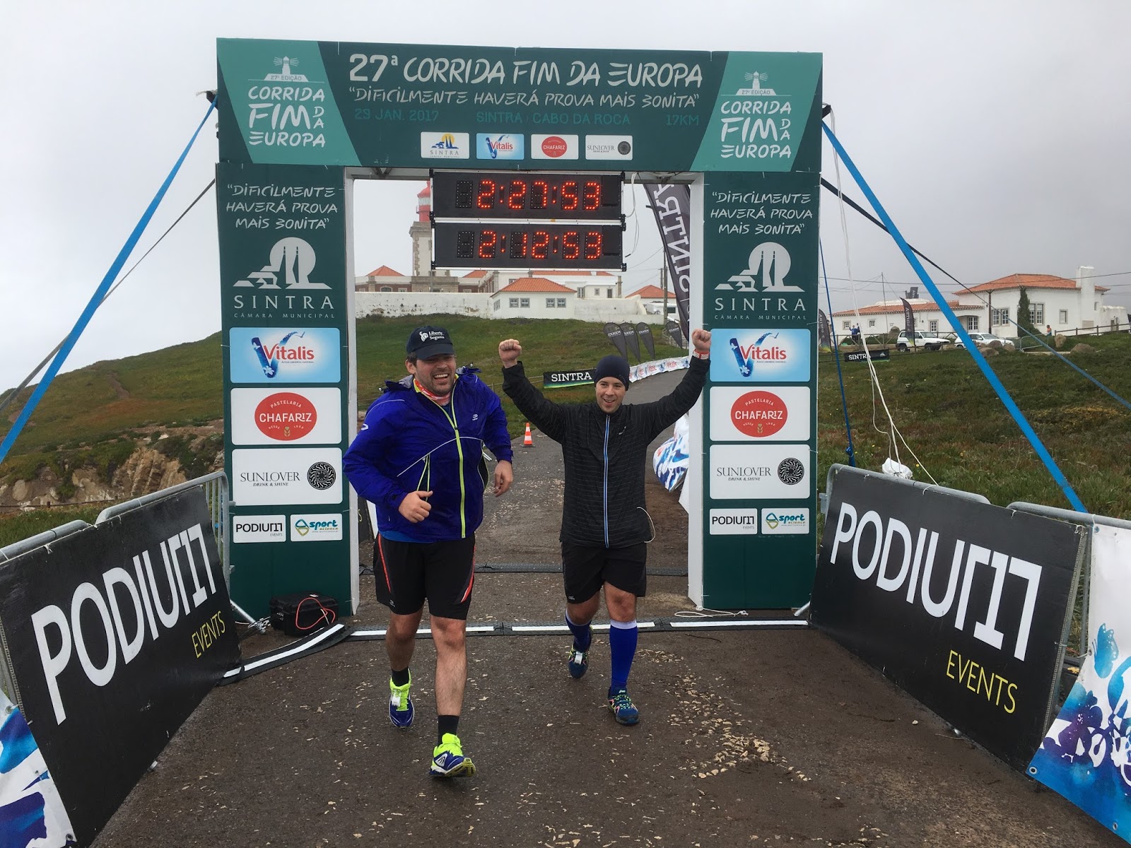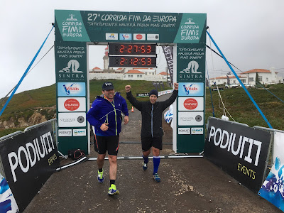 Subimos um pouco mais e estávamos no km 12!! Daí para a frente vinham as prometidas descidas!!! Virei-me para o Finhão e disse: "Bora que é sempre a descer!!!" E comecei a descer! E lá fui eu! Um pouco a frente apanhei a minha lebre que ia de phones nos ouvidos a curtir a corrida e disse também para ele: "Bora?!?!" e ele disse para seguir que ia manter o ritmo :) antes de seguir vi que o Finhão não estava comigo e avisei a minha lebre que o Finhão vinha já aí e despedi-me da minha lebre até à proxima subida!! E lá fui eu! Pensei que era hora de tentar acelarar um pouco e ver se conseguiria chegar na minha ideia maluca das duas horas!! Fui seguindo e o meu joelho ia a queixar-se pouco! Ia bem amarrado pela minha massagista e por isso... era o que desse!! Fui descendo e apreciando a vista! Havia zonas de muita humidade e até ficava na duvida se chovia, se era apenas humidade! Ao longe comecei a ver a mesma Sra que antes nos tinha acompanhado: a Sofia :) fui correndo e acabei por alcança-la e meti-me com ela!! Disse-lhe: "eles prometeram as descidas e aqui estão elas!!" :) e fomos-nos acompanhando :) íamos num passo rapido e a conversar :) e foi assim que soube o nome da Sra :) os kms iam avançando e nós íamos bem!! Íamos quase sozinhas no caminho mas o objectivo era chegar!!! Quando demos por nós estavamos a chegar à Azoia!! Atravessamos a estrada no meio de uma tremenda confusao de carros! Entretanto um pouco mais a baixou ouvi: "Ivoneee!!" e era o meu PT!!!! :D Desviei-me e fui dar-lhe um high 5 e disse-lhe: "vou ver se consigo acabar isto em duas horas!!!!" ele de resposta sorriu-me!! E eu segui!!! Apanhei de novo a minha companheira e vinha em sentido contrario uma multidao que já tinha terminado a corrida! Aí a chuva decidiu aparecer e refrescar-nos um pouco!! Muitas pessoas que vinham a subir nos incentivaram!! Umas diziam que estava quase! Outras desejavam força :) A Sra agradeceu-me pela companhia que lhe tinha feito na corrida e eu, agradeci com o mesmo carinho e sentido de gratidão :) com companhia tudo é mais simples!! Vinha com a minha lebre no pensamento... olhei muitas vezes para trás... mas nunca mais o vi... a emoção começa a apoderar-se de mim quando vejo o farol do Cabo da Roca!! E disse para a minha companheira: "O Cabo da Roca!!! Estamos quase!!!!" e ela apenas me sorriu!! Ao longe ela avistou o marido!!! Estavamos quase!!!! Ao chegar junto do Sr ele diz: "é só subir esta rampa e a meta está já a seguir!!" e eu nao aguentei nem mais uma subida e disse-lhe: "siga que eu vou já atras de si!!" ela nao me queria deixar para tras mas eu insisti!! E ela seguiu :) subi a rampa a andar e na descida... com cuidado... corri para a tão desejada meta!!!!!! Cruzei a meta sozinha!!! Com o profundo sentimento de missão cumprida!!! EU CONSEGUI!!! Os meus joelhos aguentaram!! E passavam poucos minutos das duas horas!!!!! Estava profundamente feliz!!!! :D Sentei-me ali numa pedra grande a bater palmas a todas as pessoas que passavam!!! Dava os parabens!! :D Sorria para as pessoas!! Muitas delas vinham sozinhas e muito cansadas!!! Apreciei um momento maravilhoso entre uma Sra e um Sr que cruzaram a meta juntos! Nao se conheciam de lado nenhum, e a Sra virou-se para o Sr e disse: "sem a sua ajuda eu nao teria conseguido!! muito obrigada!!" e deram um high 5!!! Passaram mais uns minutos e lá vinha a minha lebre e o Finhão :D A minha lebre nao vinha bem e isso pude ver ao longe :( mas assim que os vi aproximarem-se levantei-me e desatei a gritar por eles e a bater palmas!!!!!!!! :D